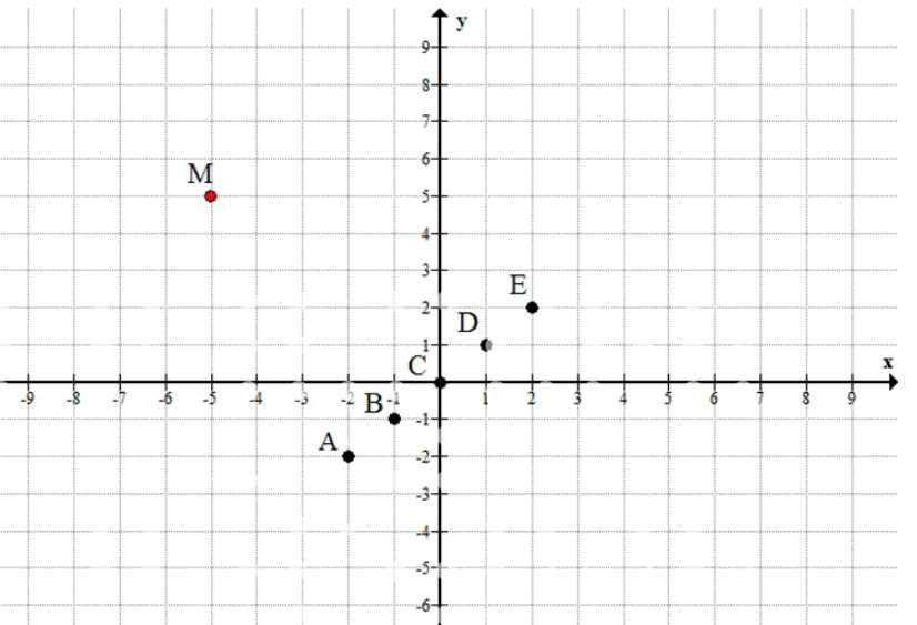 Равенство \(5=-5\) неверно, значит условие \(y=x\) для точки \(M\) не выполняется, и поэтому \(M\) не лежит на прямой, на которой лежат точки \(A\), \(B\), \(C\), \(D\), \(E\). Это совпадает с рисунком: \(A\), \(B\), \(C\), \(D\), \(E\) идут по диагонали \(y=x\), а \(M\) находится в другой части координатной плоскости и не попадает на эту диагональ.