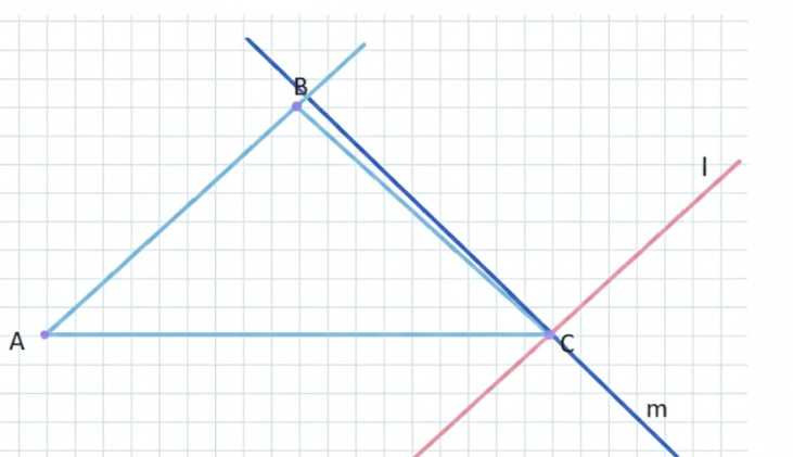 Начертите какой-нибудь треугольник \(ABC\). Через вершину \(C\) проведите прямую \(l\), параллельную стороне \(AB\), и прямую \(m\), перпендикулярную стороне \(AB\).