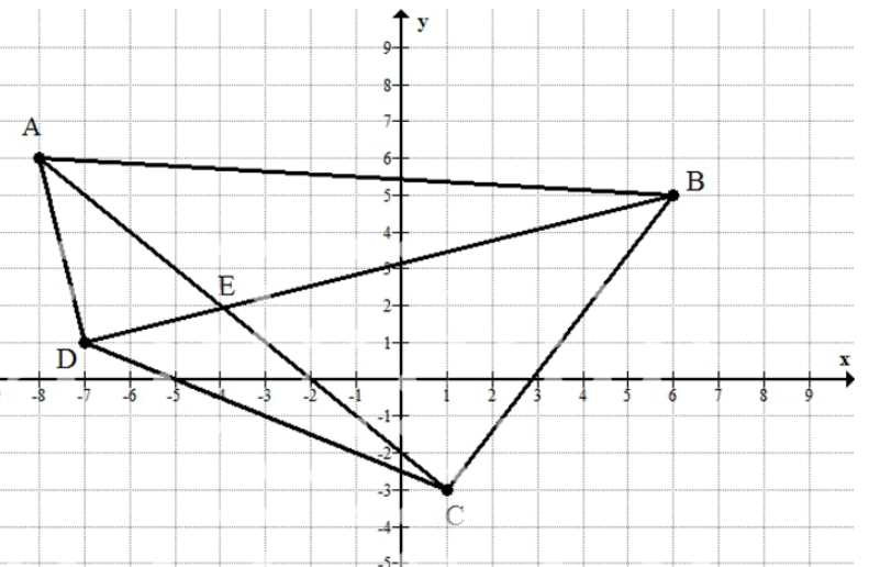 Чтобы построить четырёхугольник \(ABCD\), на координатной плоскости отмечают точки \(A(-8;6)\), \(B(6;5)\), \(C(1;-3)\), \(D(-7;1)\) и соединяют их последовательно отрезками \(AB\), \(BC\), \(CD\), \(DA\). Диагонали этого четырёхугольника — отрезки \(AC\) и \(BD\); требуется найти их точку пересечения как общую точку прямых, содержащих эти отрезки.