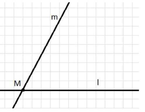 Уберите транспортир и проведите через точки \(M\) и отмеченную точку прямую — это и будет прямая \(l\). Проводите линию аккуратно по линейке в обе стороны, чтобы получилась именно прямая, а не короткий луч. В результате прямые \(m\) и \(l\) пересекаются в точке \(M\) и образуют угол заданной величины, то есть \(\angle(m,l)=62^\circ\) (берём меньший угол между прямыми).