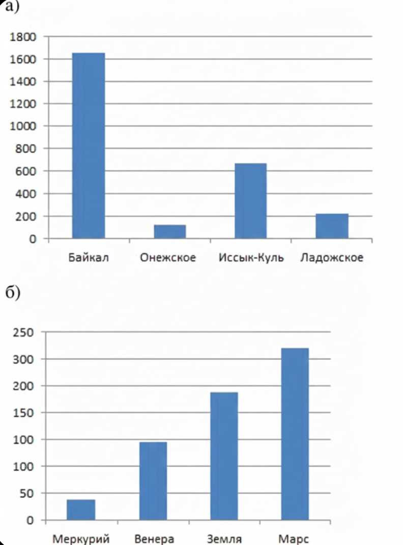 а) По оси \(x\) откладываем названия озёр, по оси \(y\) — глубину в метрах. Выбираем масштаб (например, 1 деление = 200 м) и строим 4 столбца высотой: Байкал — 1620 м, Онежское — 127 м, Иссык‑Куль — 668 м, Ладожское — 225 м.