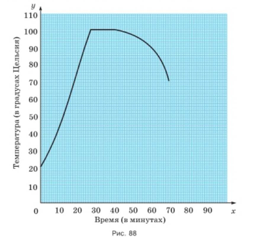 На рисунке 88 показан график температуры воды в электрическом самоваре. На прямой \(x\) откладывали время в минутах после включения самовара, а на прямой \(y\) — температуру воды в градусах Цельсия. Определите по графику: