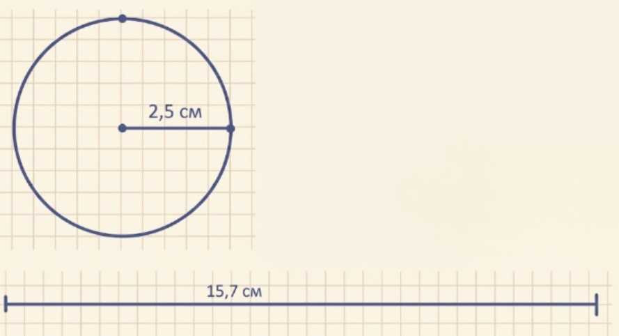 Выполняем умножение: \(5\cdot 3{,}14=15{,}70\), то есть \(C=15{,}7\) см (ноль в конце десятичной дроби можно не писать). Полученная длина окружности соответствует рисунку: окружность с радиусом \(2{,}5\) см и отрезок, равный ее длине, имеет длину \(15{,}7\) см.