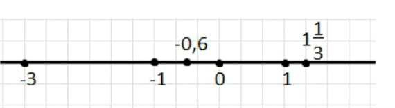 Точка \(M(-3)\) ставится ровно в делении \(-3\), так как координата целая и дополнительного деления отрезка не требуется. Точка \(P(-0{,}6)\) имеет координату между \(-1\) и \(0\): это число отрицательное, значит точка лежит слева от \(0\), и по модулю меньше \(1\), значит она находится ближе к \(0\), чем к \(-1\). Точку \(K(1\frac{1}{3})\) отмечаем справа от \(1\), потому что \(1\frac{1}{3}>1\); дробная часть \(\frac{1}{3}\) означает, что отрезок от \(1\) до \(2\) нужно мысленно разделить на \(3\) равные части и взять первую часть от \(1\) вправо, то есть \(K\) находится в точке \(1+\frac{1}{3}\).