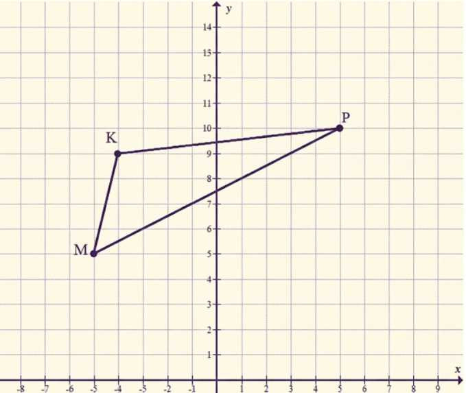Отметьте на координатной плоскости точки \(M(-5;5)\), \(K(-4;9)\), \(P(5;10)\) и соедините их отрезками \(MK\), \(KP\), \(PM\), получив треугольник \(MKP\).