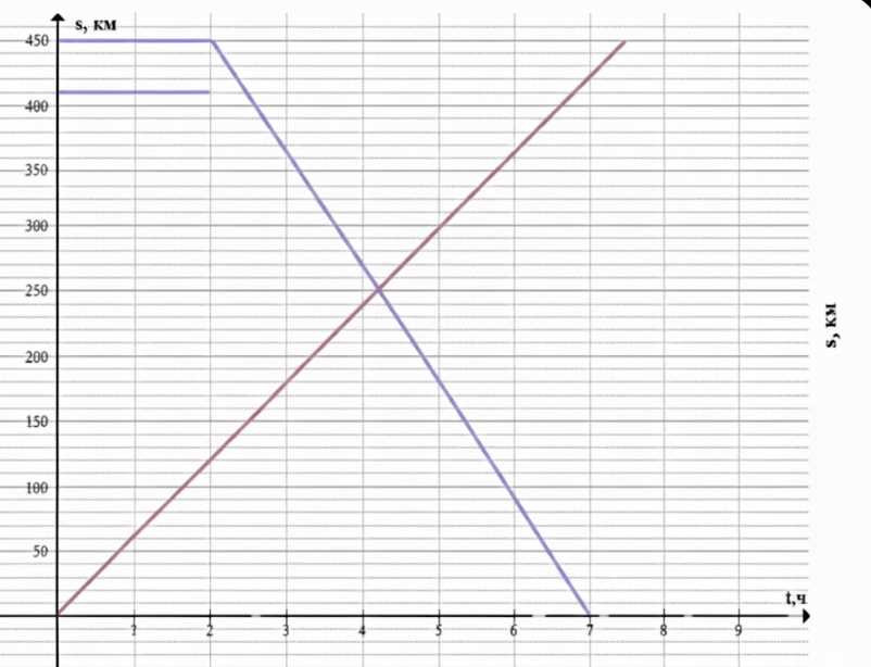 Легковая до момента \(t=2\) еще не выехала и находится в противоположном пункте на расстоянии \(450\) км от начала отсчета, поэтому на графике это горизонтальный отрезок \(S_{\text{легк}}(t)=450\) при \(0\le t\le2\). После выезда она едет к началу отсчета со скоростью \(90\) км/ч, поэтому \(S_{\text{легк}}(t)=450-90(t-2)\) при \(t\ge2\); точка пересечения графиков соответствует встрече: при \(t=4{,}2\) получаем \(S=60\cdot4{,}2=252\) км, и также \(450-90(4{,}2-2)=252\) км.