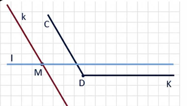После этого через ту же точку \(M\) проведите прямую \(l\), параллельную стороне \(DK\), то есть \(l \parallel DK\). Аналогично предыдущему шагу: ориентируйте линейку по стороне \(DK\), затем параллельным переносом расположите её так, чтобы линия проходила через \(M\), и проведите прямую \(l\). В итоге через \(M\) получаются две прямые, каждая параллельна своей стороне угла: \(k \parallel CD\) и \(l \parallel DK\), как на рисунке.